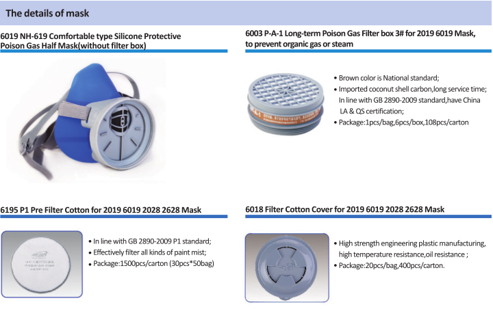 ●With a P-A-1(3#) Filter,to prevent organic gas or steam,for example, Aniline, gasoline, acetone, carbon disulfide, alcohols, ethers, aldehydes, carbon tetrachloride, three potassium chloride, methyl chloride, nitrobenzene, chloropicrin;